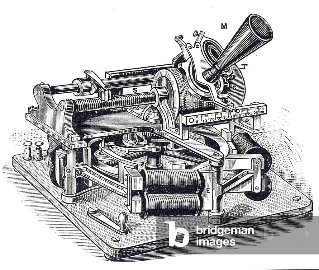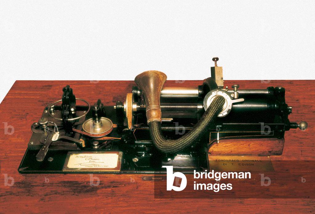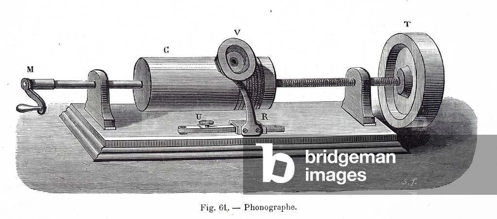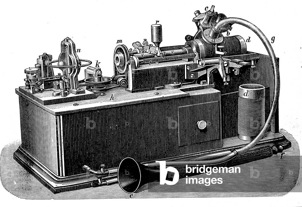 UIG5616466 Illustration of Edison's recording apparatus. The apparatus was used for making recordings on a wax disc, showing the clockwork mechanism housed in the stand under the disc. Dated 19th Century. 01/01/1878