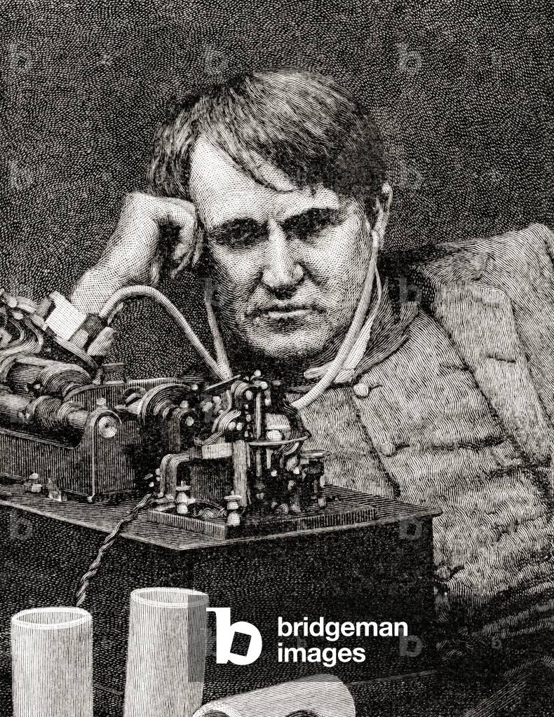 XEE4134542 Thomas Edison (1847-1931), American physicist, in New York, hearing the first “phonogram” sent from England. (From a photograph communicated to “La Nature” by Colonel Gouraud). Engraving in “” La Nature: revue des sciences et de leurs applications aux arts et a l'industrie”” of 4 May 1889.