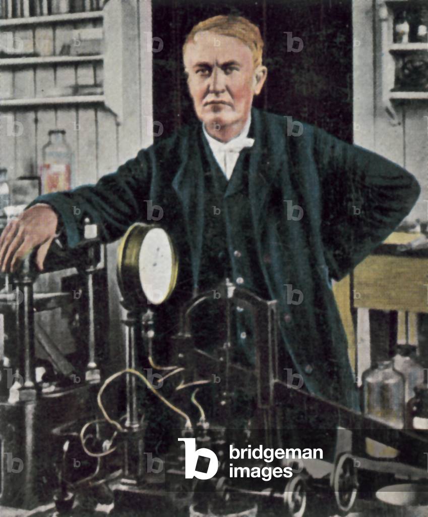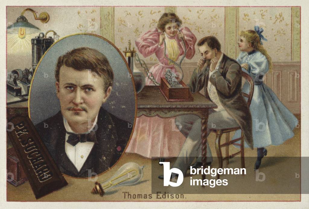 LLM1091411 Thomas Edison (1847-1931), American inventor. French educational card, late 19th/early 20th century. From a series on benefactors of humanity.