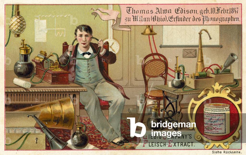 LLM1093599 Thomas Edison, American inventor of the phonograph. Liebig educational card, late 19th or early 20th century.