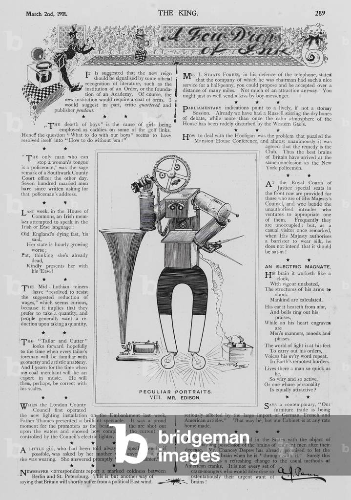 LLM7201830 Caricature of Thomas Edison (1847-1931), American; inventor. Illustration from The King (George Newnes, Limited, London, 2 March 1901).