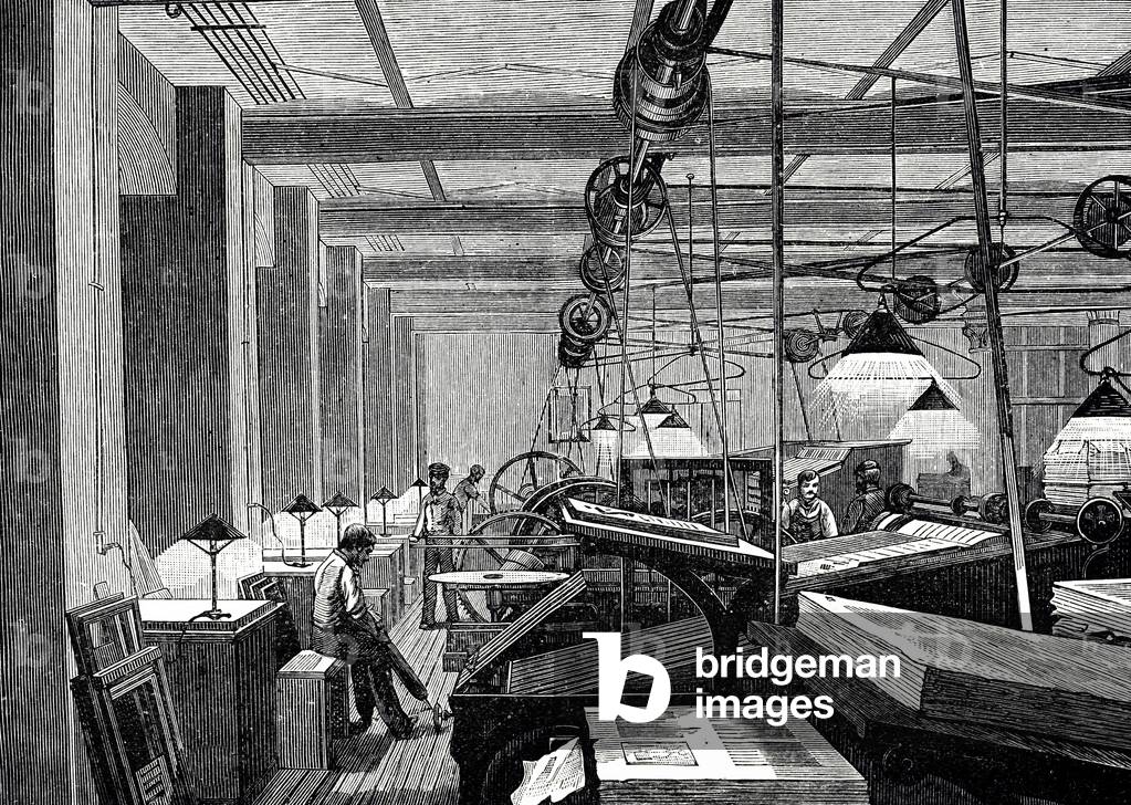 UIG5311721 Engraving depicting Messrs Jaenecke Brothers printing office in Hanover fitted with Edison electric lamps. Dated 19th century.
