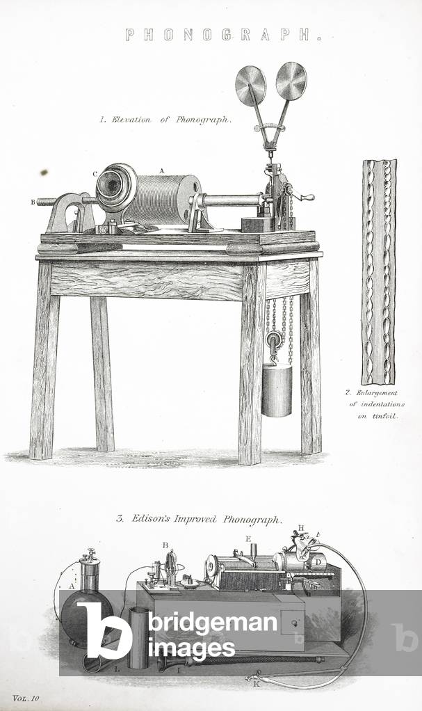 UIG5309481 Engraving depicting and Edison phonograph. Fig. 1: Clockwork driven force. An improvement on the original model which was turned by hand. Fig. 3: Electrical version powered by a wet cell (A). The phonograph was invented in 1877, for the mechanical recording and reproduction of sound by Thomas Edison. Thomas Edison (1847-1931) an American inventor and businessman. Dated 19th century01/02/1890