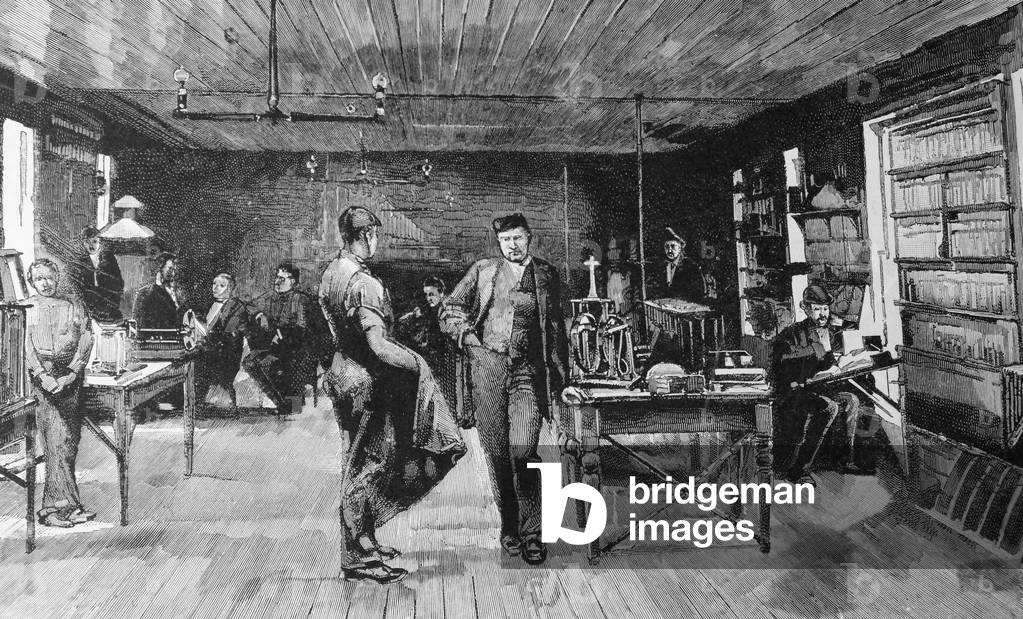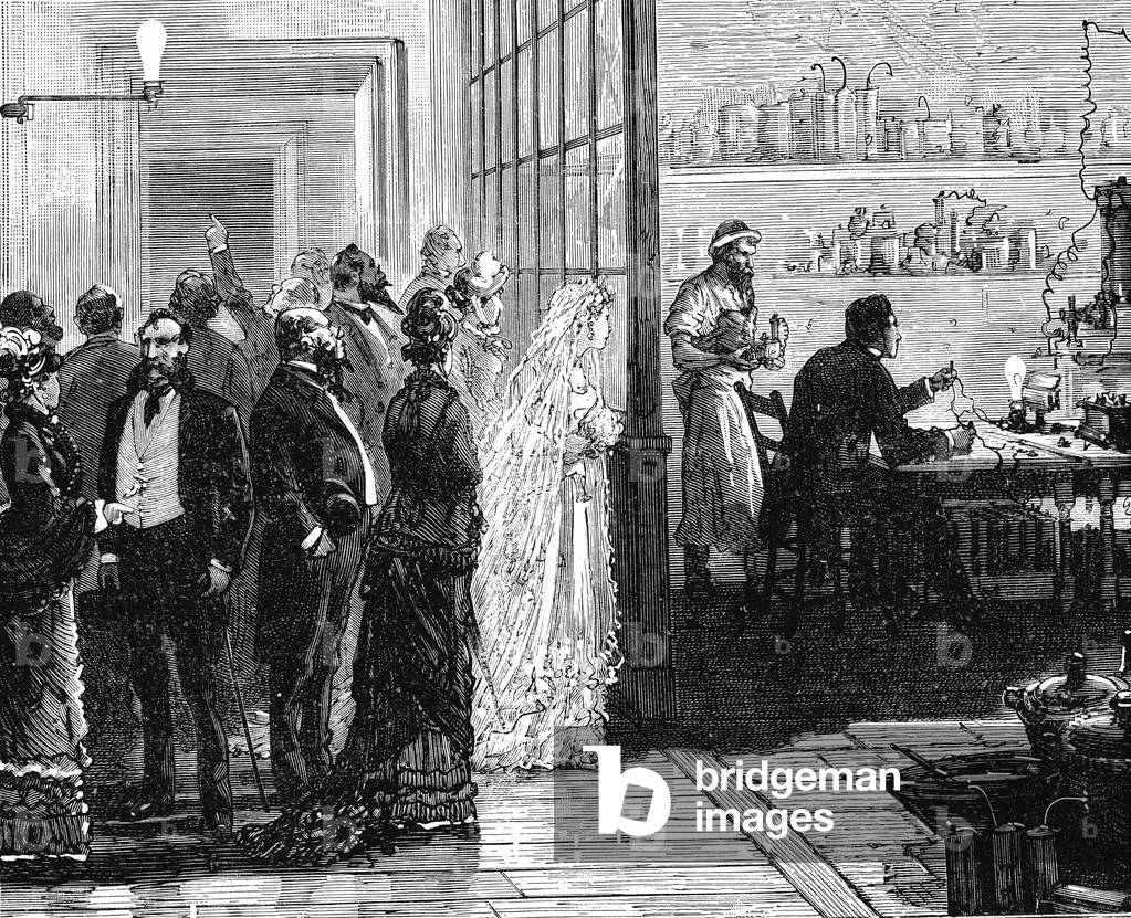 HIM5254636 La generatrice de lumiere electrique invention de Thomas Edison dans sa maison a Menlo Park dans le New Jersey, Etats Unis. Gravure in ""Scientific American"", 1879. Oxford Science Archive