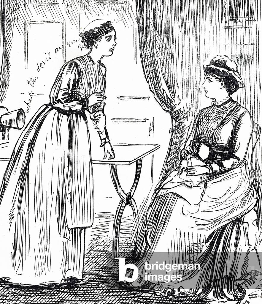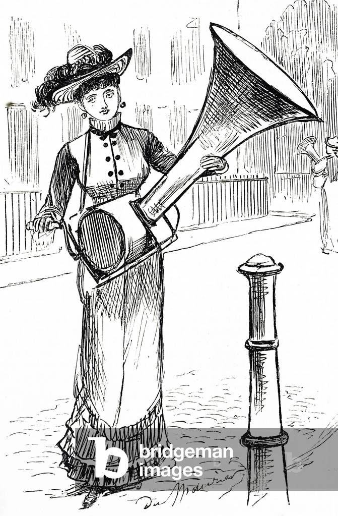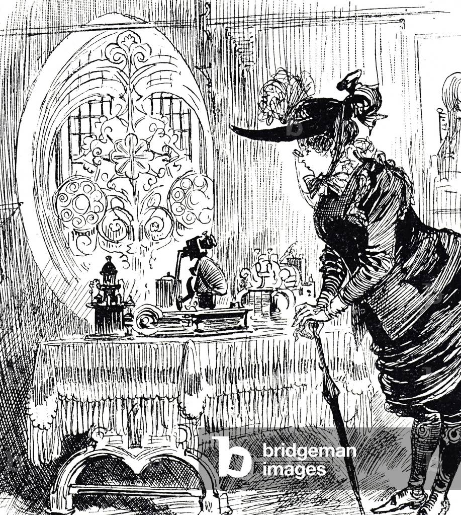 UIG5308813 Engraving depicting a visitor being interrogated by a phonograph in the hall table before being received by the person she is visiting. Dated 19th century01/02/1890