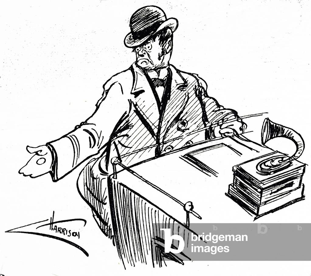 UIG5308854 Cartoon depicting a proposed use of the Edison phonograph - the introduction of taximeters to London cabs. A phonograph is the mechanical recording and reproduction of sound. Invented by Thomas Edison (1847-1931) an American inventor and businessman. Dated 20th century2589