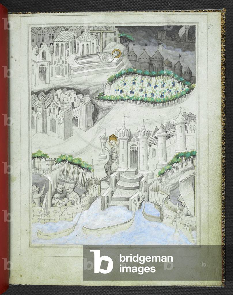 BL3964156 The manuscript contains no text, but a series of 28 full-page miniatures (tinted grisaille drawings on green parchment) illustrating the Voyage d'outre mer, attributed to Sir John Mandeville.