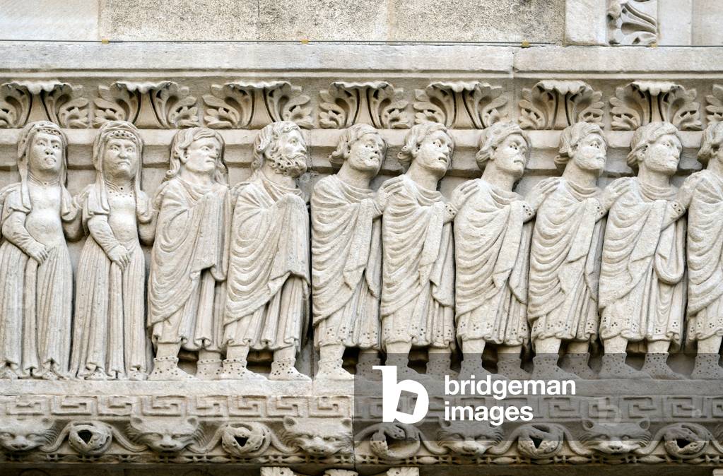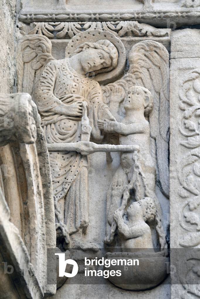 HLR5891561 Romanesque Sculpture of Archangel Saint Michael Offering a Saved Soul to the Bosom of Abraham on the Façade of the Church of Saint Trophime Arles France