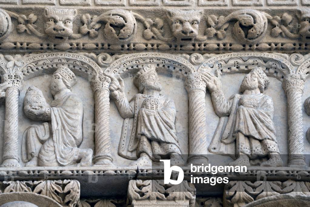 HLR5891563 Visitation of the Magi; Romanesque Sculpture of the Biblical Magi; Three Wise Men or Three Kings on the Façade of the Church of Saint Trophime Arles France
