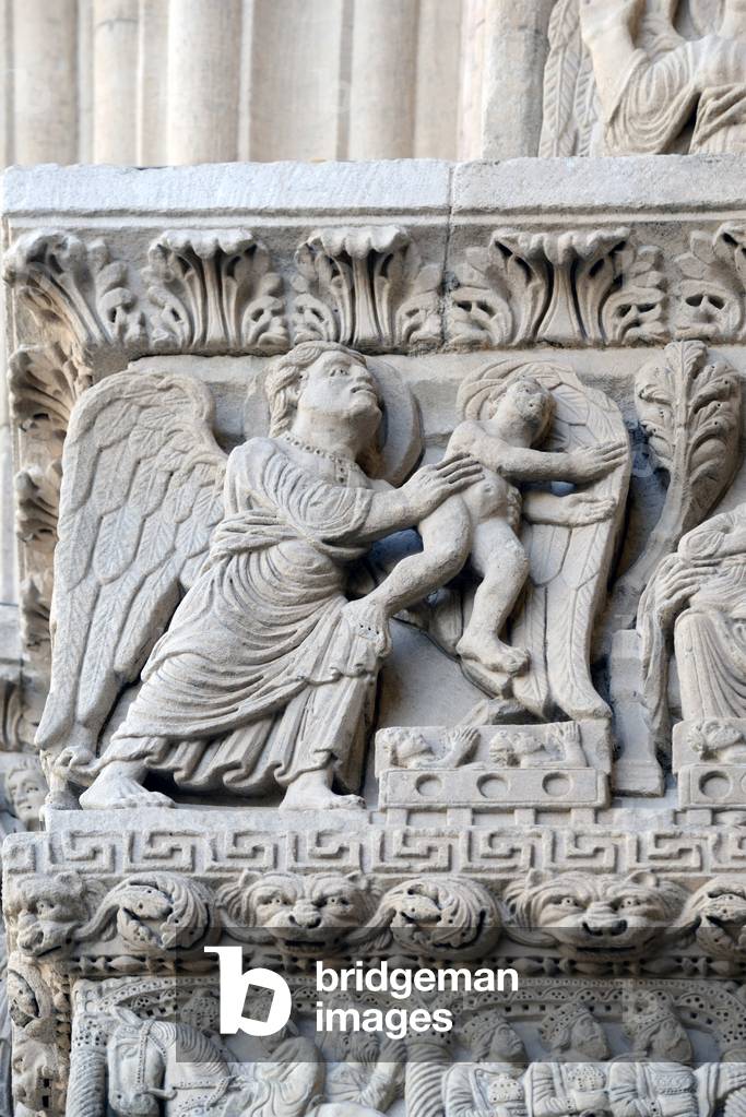 HLR5891578 Romanesque Carving of Infant Jesus or Baby Jesus on Façade of the Church of Saint Trophime Arles France