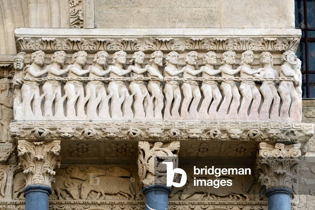 HLR5891592 Bas-Relief Romanesque Sculpture of Chained Sinners in Procession on Way to Hell on Façade of the Church of Saint Trophime Arles France