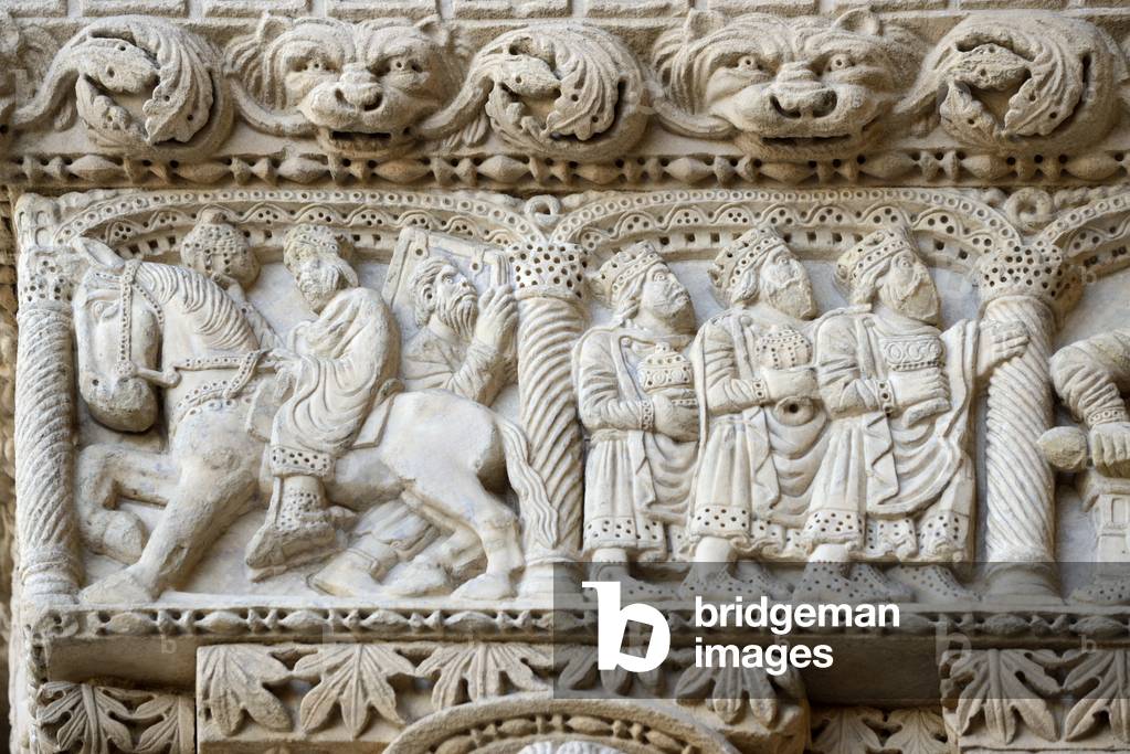 HLR5891564 Horseman & Visitation of the Magi; Romanesque Sculpture of the Biblical Magi; Three Wise Men or Three Kings on the Façade of the Church of Saint Trophime Arles France