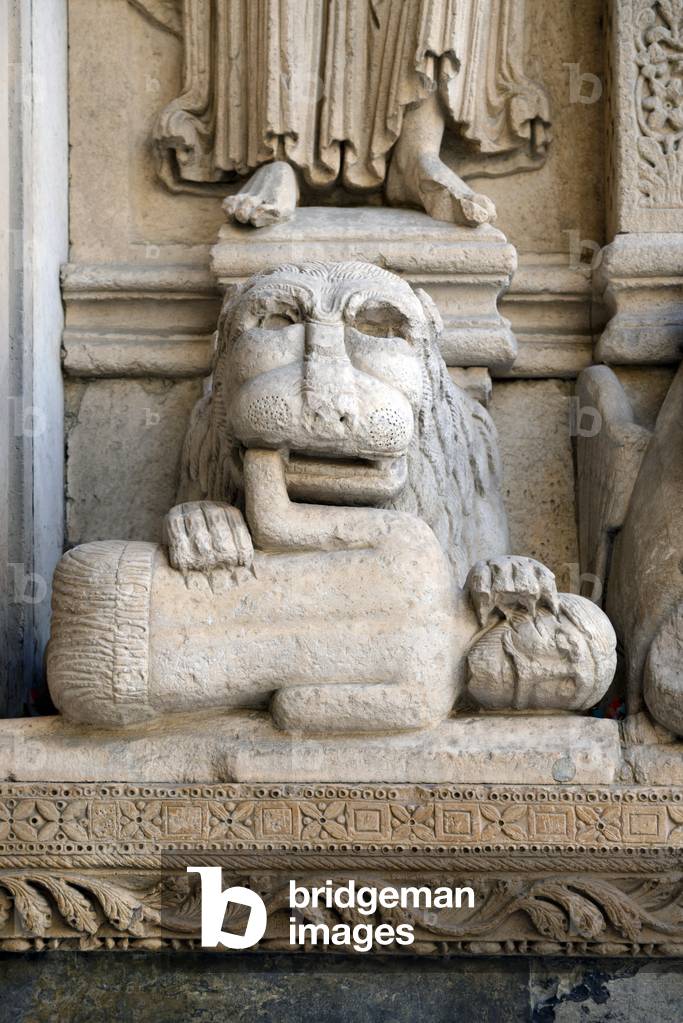 HLR5891557 Romanesque Sculpture of a Lion Devouring a Man or a Man-Eater on the Façade of the Church of Saint Trophime Arles France