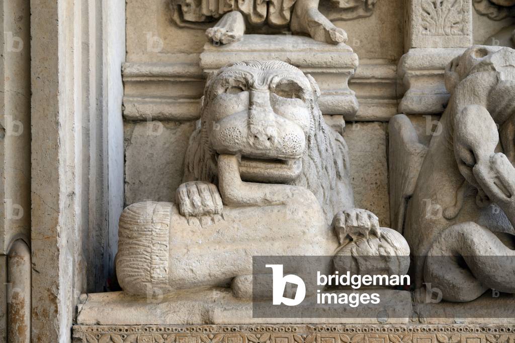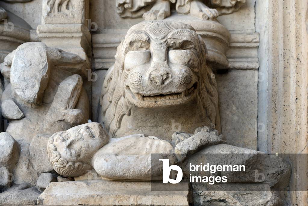 HLR5891556 Romanesque Sculpture of a Lion Devouring a Man or a Man-Eater on the Façade of the Church of Saint Trophime Arles France