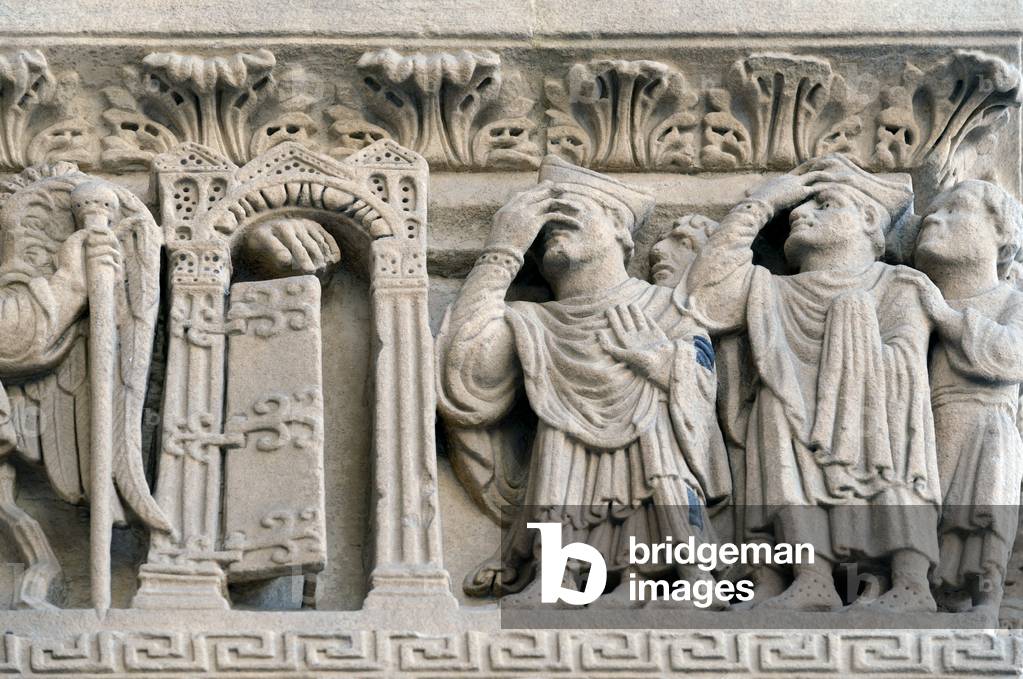HLR5891550 Romanesque Sculpture of Archangel Saint Michael & the Damned Refused Entrance to Heaven on the Façade of the Church of Saint Trophime Arles France