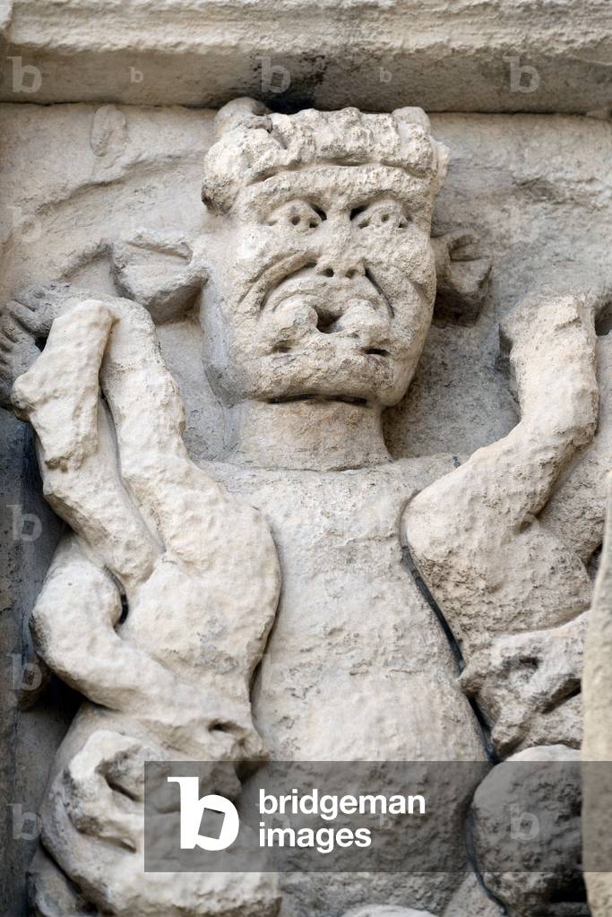 HLR5891569 Weathered Romanesque Sculpture of Devil or Demon on the Façade of the Church of Saint Trophime Arles France