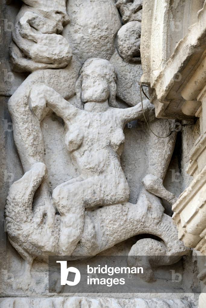 HLR5891570 Weathered Romanesque Sculpture of Woman Riding a Dragon; Lizard or Crocodile on the Façade of the Church of Saint Trophime Arles France