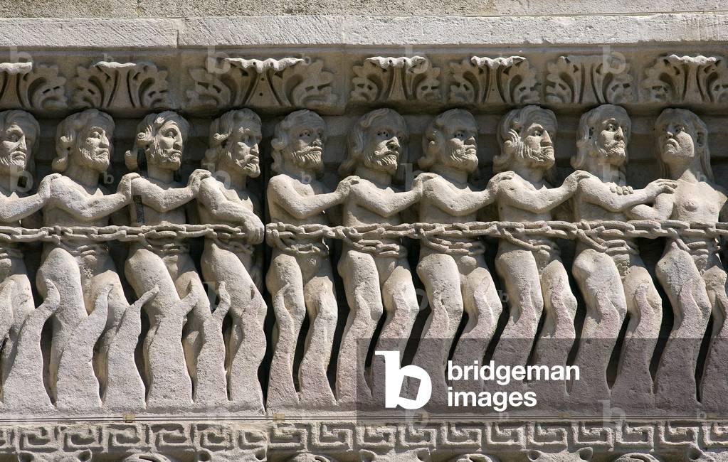 HLR5891591 Bas-Relief Romanesque Sculpture of Chained Sinners in Procession on Way to Hell on Façade of the Church of Saint Trophime Arles France