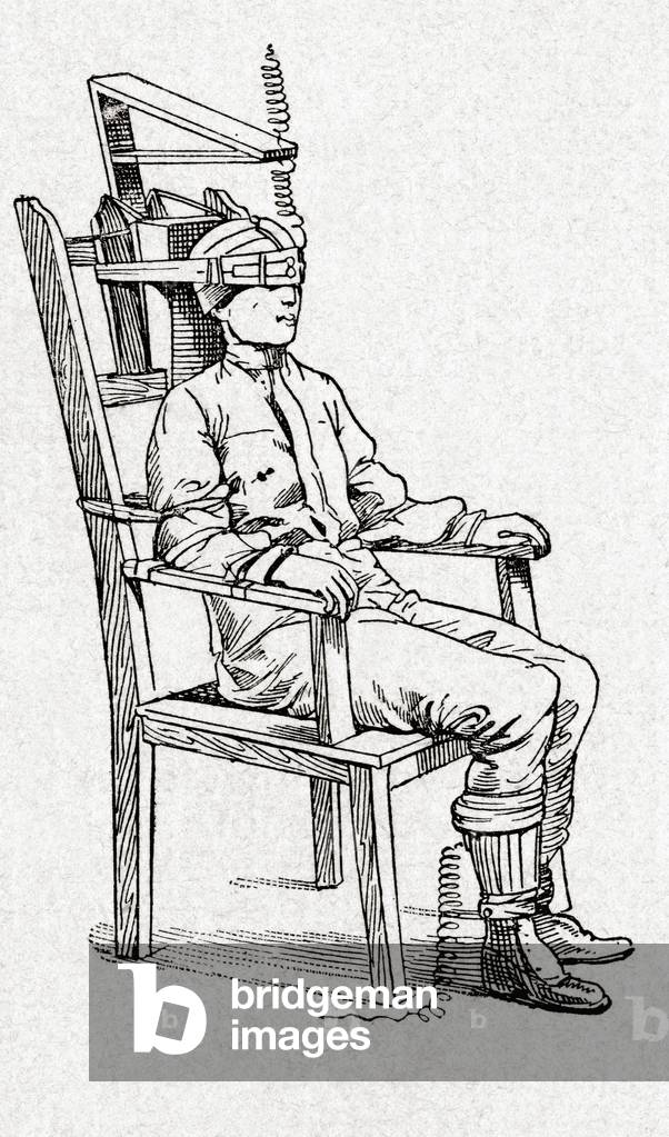 KWE3253018 Execution by electrocution using an electric chair. From Enciclopedia Ilustrada Segui, published c. 1900.