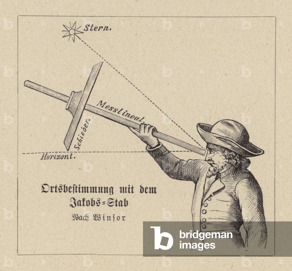 LLM8663895 Navigation using a Jacob's Staff. Illustration for Der Mensch und die Erde by Hans Kraemer (Deutsches Verlagshaus Bong, 1906-1913).