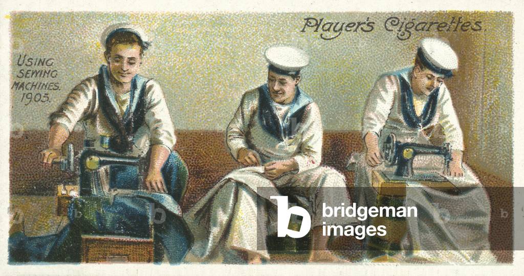 LLM2780347 Using sewing machines, 1905. Illustration for one of a series of cigarette cards on the theme of Life on Board a Man of War in 1805 and 1905, published by John Player, early 20th century.