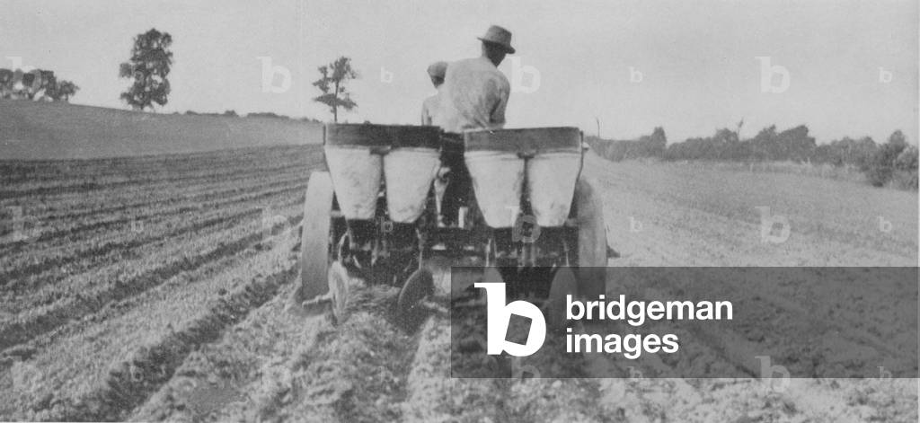 SIC830969 Planting Potatoes For Better Crops-Bigger Profits - black and white image of a farmer using an Oliver Potato Planter as he goes through a field, which allows him to plant potatoes with more accuracy than a human.