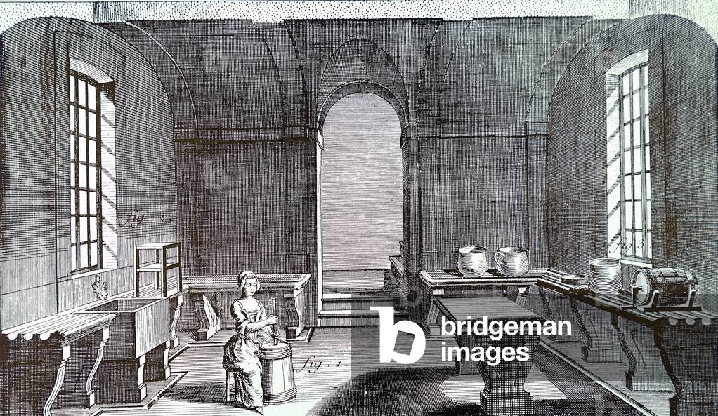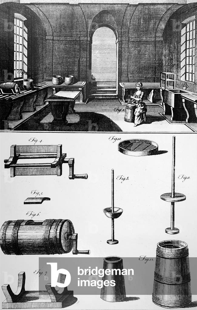 UIG3732542 Engraving depicting a dairy and dairymaid using a piston churn. Below are diagrams of a piston and barrel churns. Dated 18th Century.