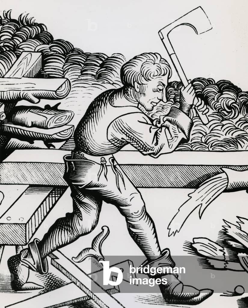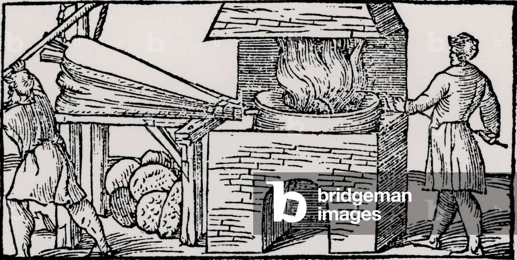 UIG863693 Using bellows to increase the draught in a furnace for refining copper. From "De la pirotechnia" by Vannoccio Biriguccio (Venice, 1540).
