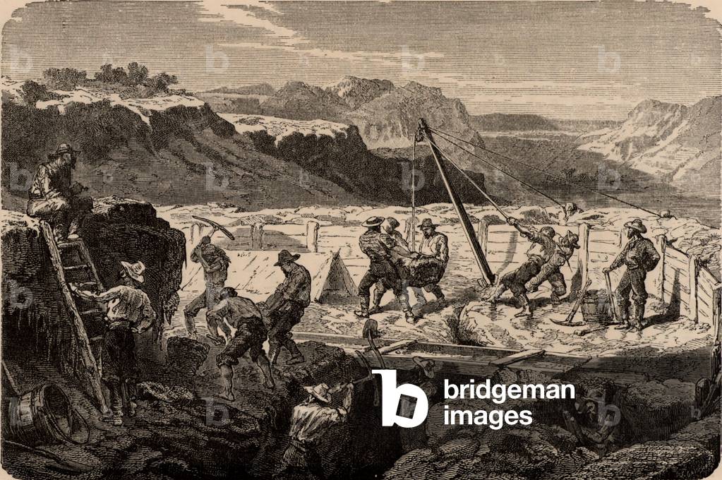 UIG863774 Using a 'long tom' to wash for gold in the Californian gold fields. The miners diverted the water courses, then dug out the ore-bearing sands which they washed for gold. The Californian Gold Rush began in 1849. From "Underground Life; or, Mines and Miners" by Louis Simonin (London, 1869). Wood engraving.