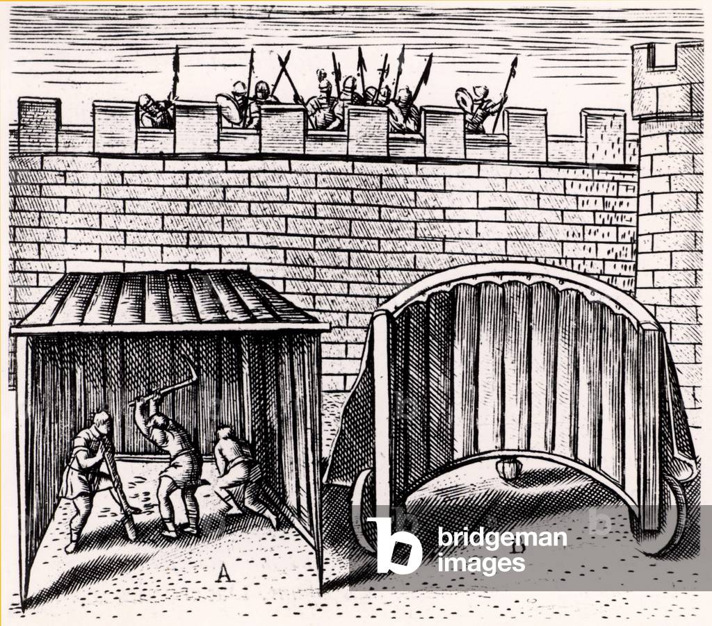 UIG863345 Military engineering: Sappers using a 'sow', A, to begin excavations outside the walls of a city under siege. B is a wheeled shield with its tough leather protective cover turned back to show its construction. From "Poliorceticon" by Justus Lipsius (Antwerp, 1605). Copperplate engraving.