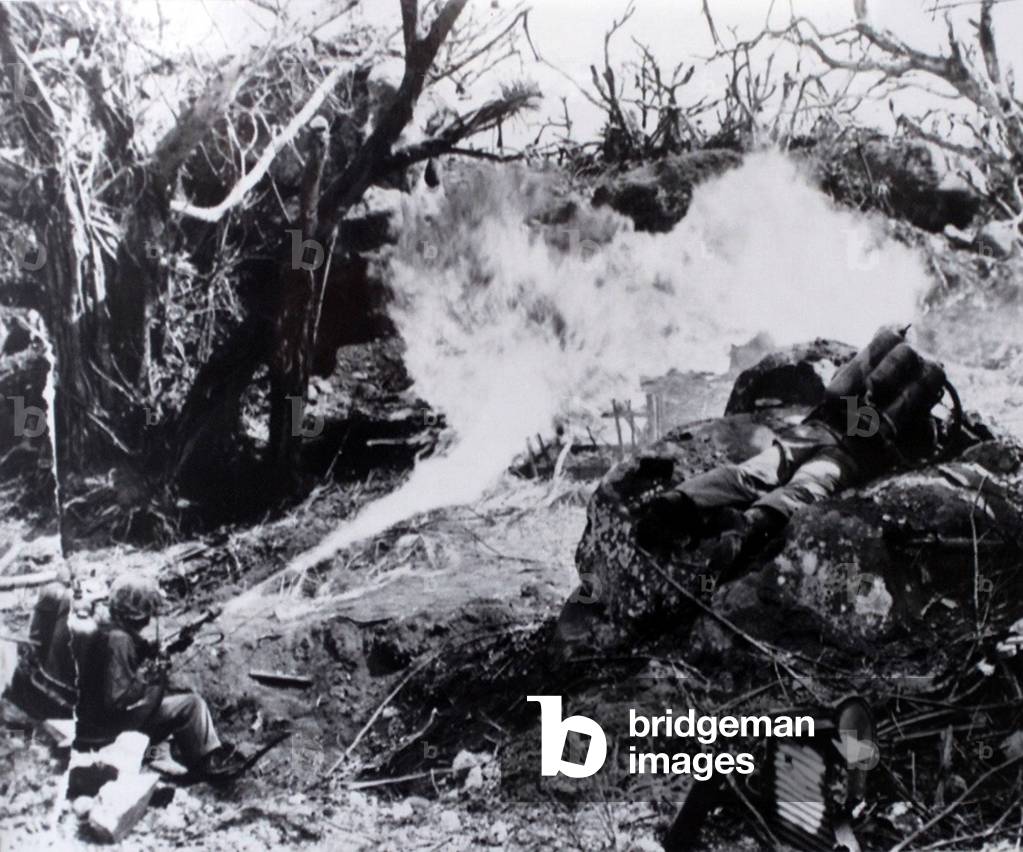 UIG1580865 Photograph of US Marines using flamethrowers on a Japanese position, Tarawa, Kiribati. Dated 1944