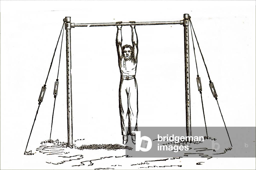 UIG3735327 Illustration depicting a man exercising using a horizontal bar to stretch and strengthen arms. Dated 19th century.