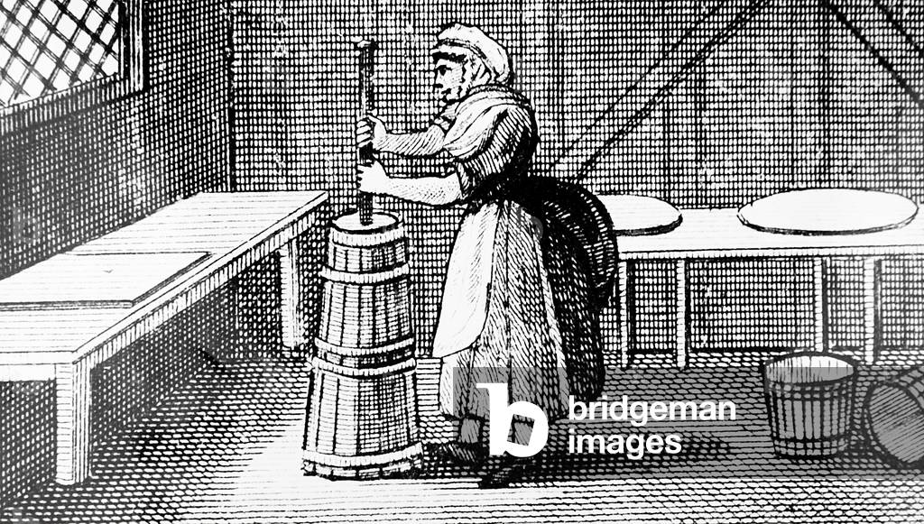 UIG3732543 Engraving depicting a dairy and dairymaid using a barrel churn. Dated 18th Century.