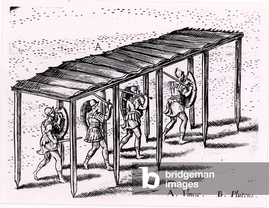 UIG864347 Roman soldiers using a 'cat' or protective covering for troops attacking city walls. From "Poliorceticon" by Justus Lipsius (Antwerp, 1605). Copperplate engraving.