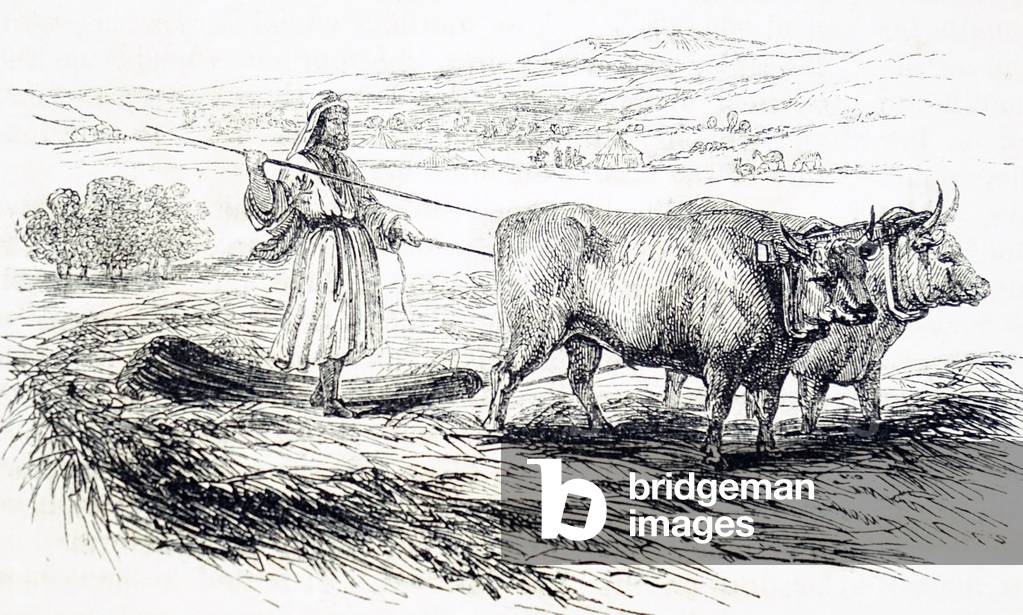 UIG3732438 Engraving depicting threshing using a drag pulled by oxen in Syria. Dated 19th Century.