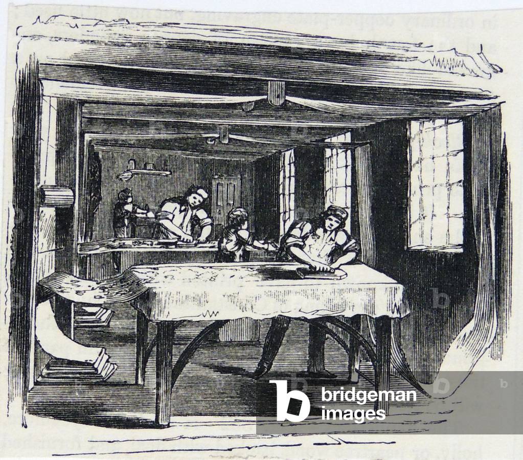 UIG2602638 Printing Calico using hand blocks. Engraving, London, 1860.