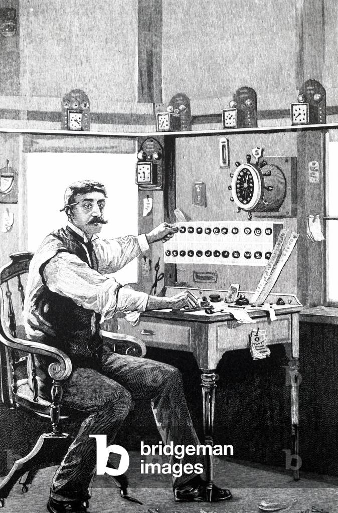 UIG3733899 Illustration depicting a train dispatcher using a Morse key to send a message down the line on the railway telegraph system. Dated 19th century.