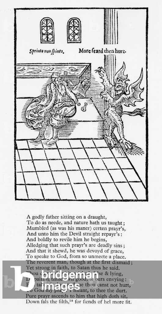 UIS5084550 Using a water closet, c 1596. This illustration, titled 'Visit of the devil to the old man', comes from a humorous pamphlet 'A New Discourse of a Stale Subject, called the Metamorphosis of Ajax' written by the writer John Harington, or Harrington, a godson of Queen Elisabeth I. 'Ajax' was code for 'jakes' - Elizabethan slang for privy. Harington was using the water closet as a metaphor in this pamphlet, to attack the elements of hypocrisy that he saw in society. The book contains extensive literary allusions and double meanings. The water closet shown was a wash-down system with a valve in the bottom of the water closet - both still elements of the modern flush toilet. ©SSPL/Science Museum