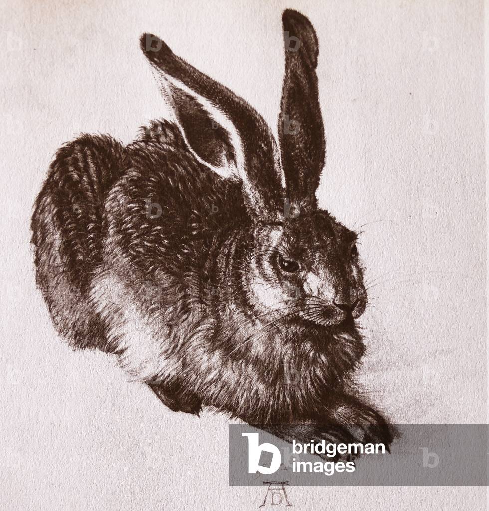 Young Hare. Nature study. Watercolor drawing.Albrecht Dürer (1471-1528); Upper German SchoolJunger FeldhaseJunger Feldhase. Naturstudie. Aquarellzeichnung.Handzeichnungen alter Meister aus der Albertina und anderen Sammlungen. Herausgegeben von Joseph Schönbrunner und Dr. Joseph Meder. Wien, Gerlach & Schenk. Verlag für Kunst und Kunstgewerbe.
