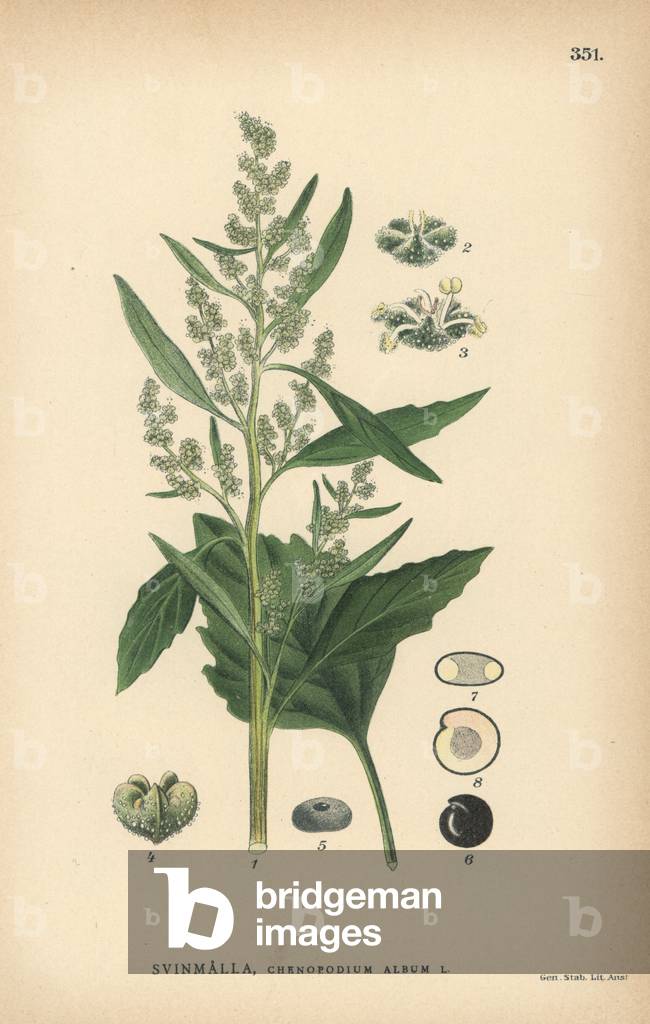 FLO5856105 Lamb's quarters, Chenopodium album. Chromolithograph from Carl Lindman's "Bilder ur Nordens Flora" (Pictures of Northern Flora), Stockholm, Wahlstrom & Widstrand, 1905. Lindman (1856-1928) was Professor of Botany at the Swedish Museum of Natural History (Naturhistoriska Riksmuseet). The chromolithographs were based on Johan Wilhelm Palmstruch's "Svensk botanik," 1802-1843.