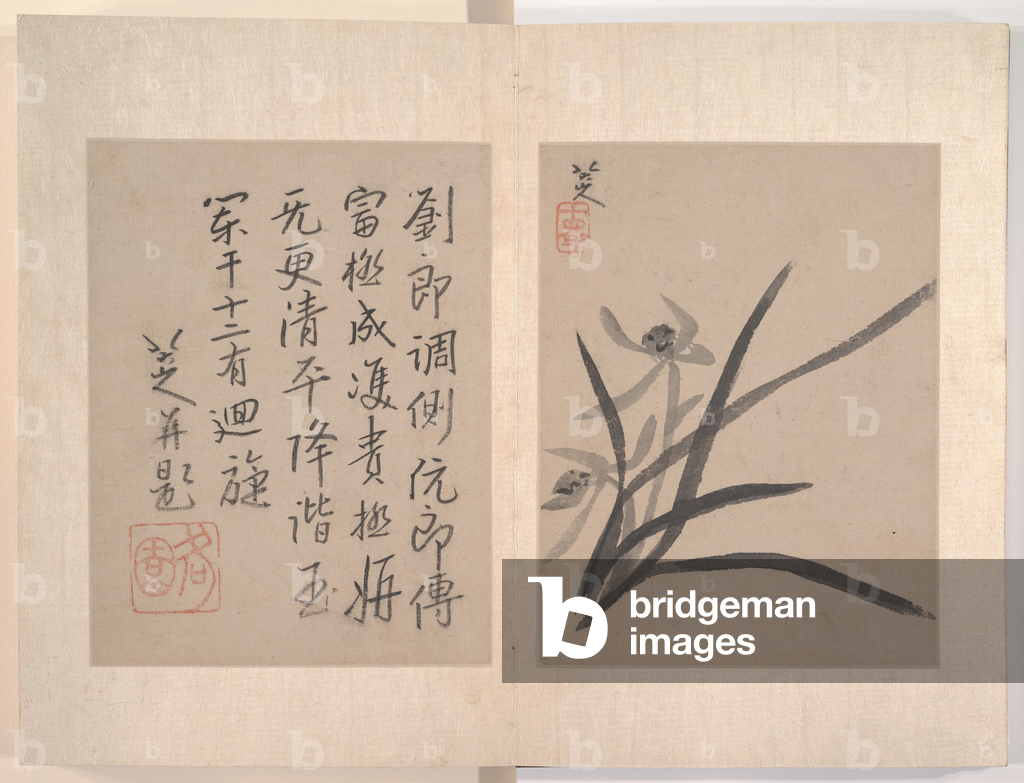XOS11876707 China; Attributed to Bada Shanren (Zhu Da) (Chinese, 1626-1705); Qing dynasty (1644-1911). Paintings; Image: 7 3/4 in.x6 in. (19.7x15.2 cm) Sheet: 11 in.x7 1/4 in. (27.9x18.4 cm) double leaf: 11x14 5/8 in. (27.9x37.1 cm)