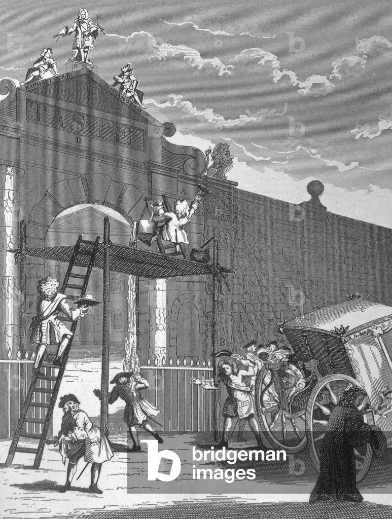 UIG2625669 Engraving by british artist & engraver, William Hogarth 1697–1764: The Man of Taste. At the top of Burlington Gate the statue of architect William Kent, submissively admired by Raffael and Michelangelo laterally at his feet. On a scaffold below Alexander Pope white-washing the gate and in his ardor giving both passers-by and the coach of the Duke of Chandos lots of slush 1757.