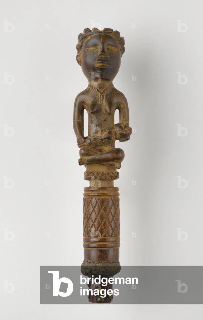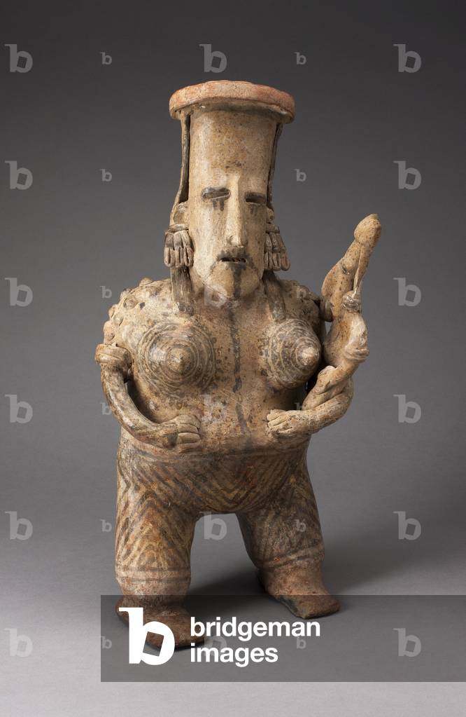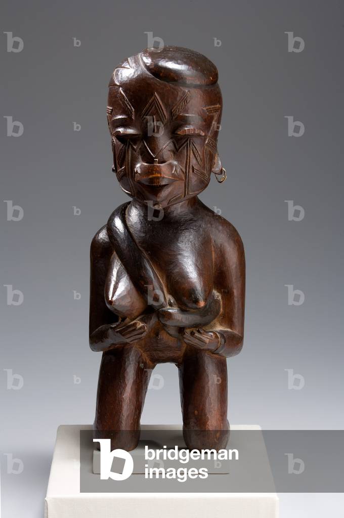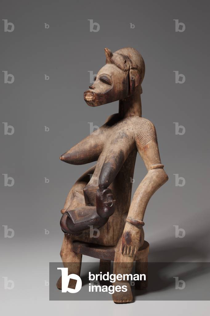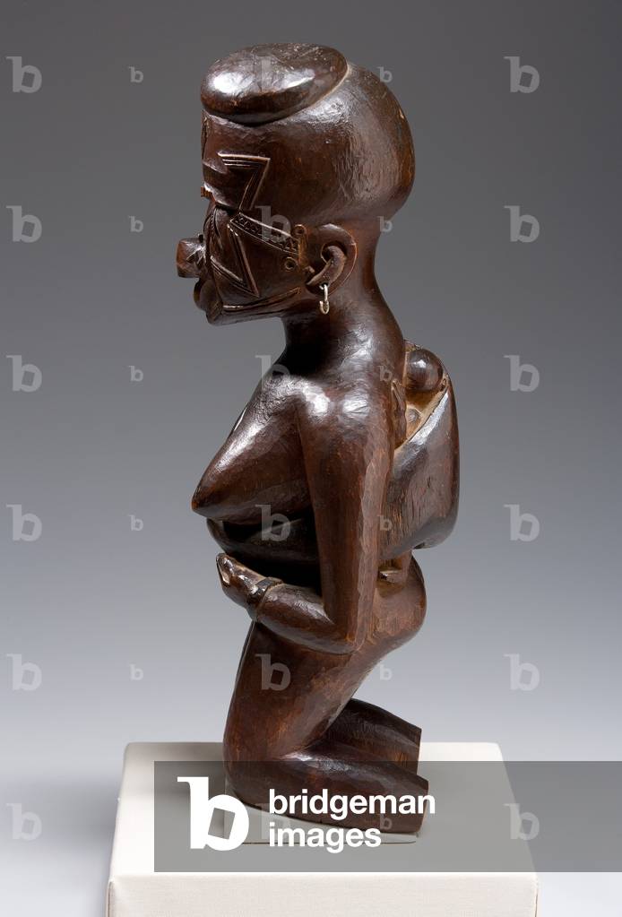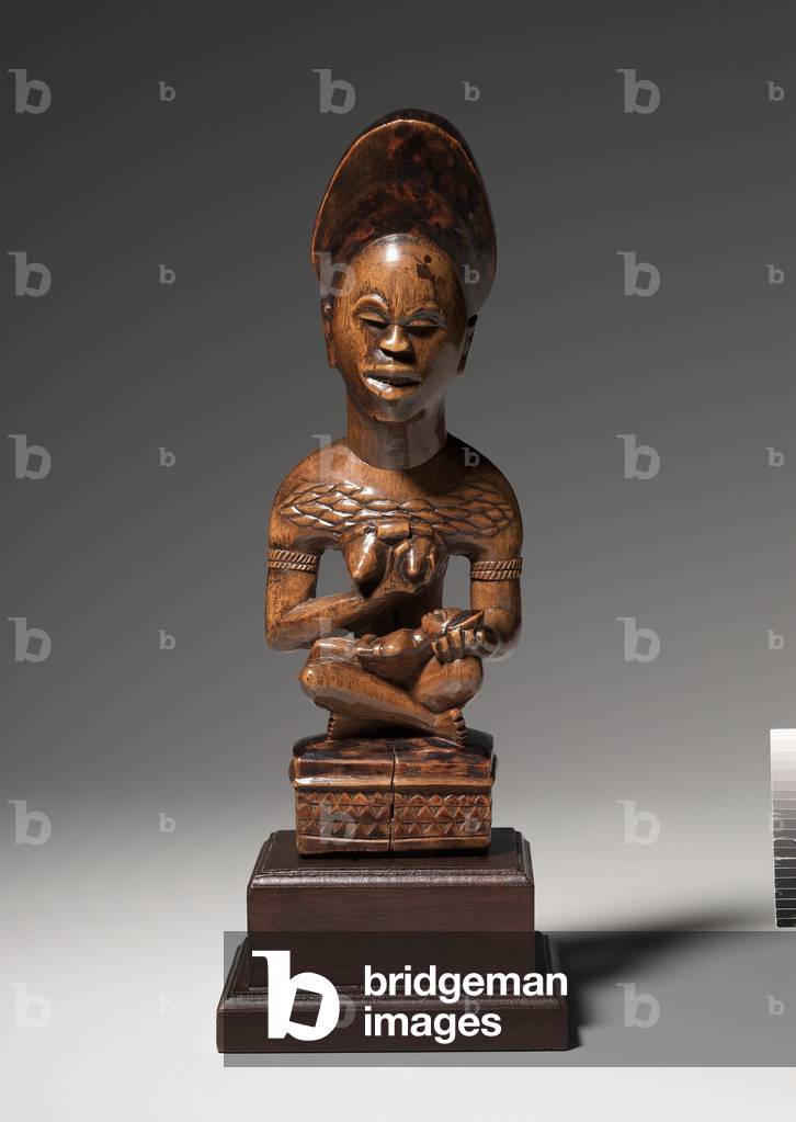XCL500324 This mother-and-child figure was probably part of a cult concerned with the treatment of infertility. Both her jewelry and her seated pose indicate that the woman occupied a high rank in her community. Her miter-shaped hairstyle, chiseled teeth, and raised body scars--considered to be marks of beauty and perfection--signal that the woman incarnates the founding ancestor of a kinship group.