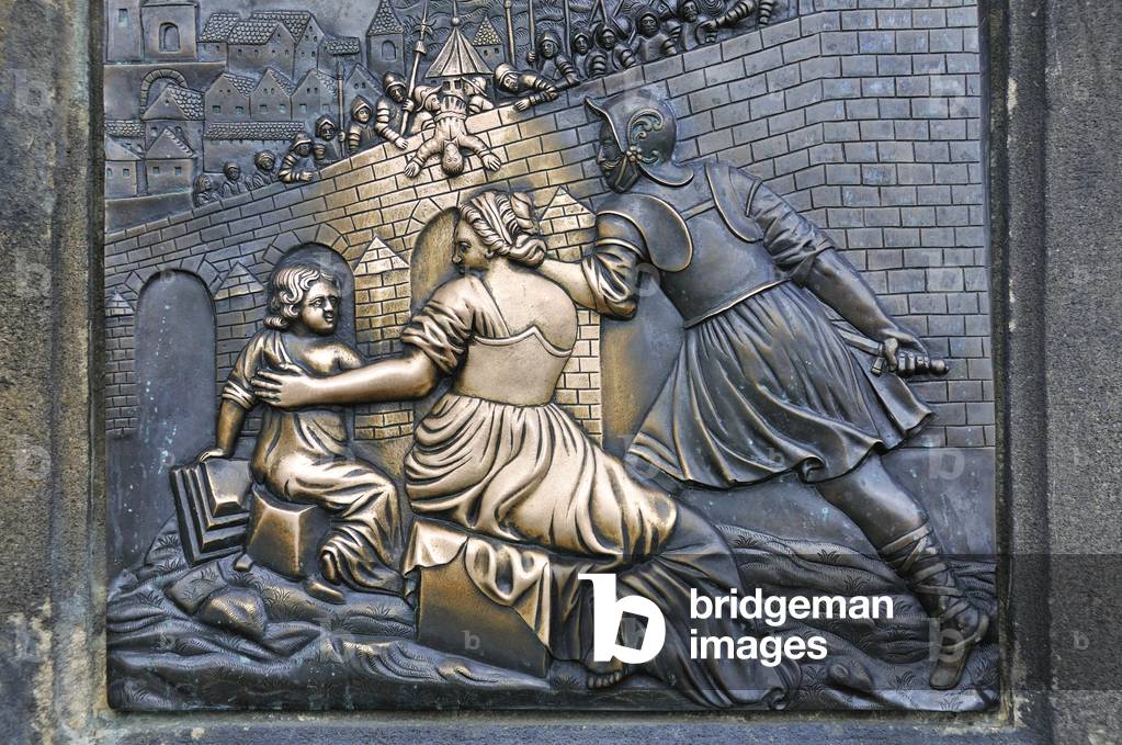 STF810522 The martyrdom of Saint John of Nepomuk (*Pomuk near Pilsen c. 1350 - +20.3.1393, bohemian priest, Martyr, Saint), who was thrown from the Charles bridge and drowned. Relief plate at the pedestal of the Statue on the Charles Bridge. After the legend touching the figures brings luck and grants wishes.