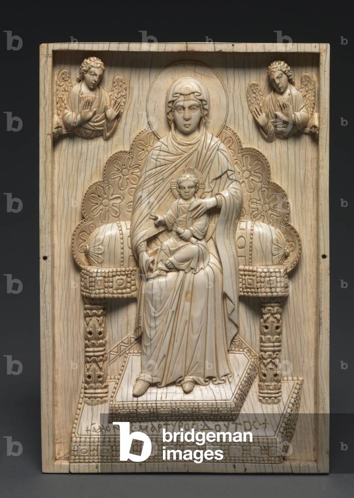 XCL491105 The Mother of God is seated on a lavishly carved, high-backed throne. Two angels hover above, drawing attention to the Christ child poised in her lap. Representations of the enthroned Virgin and Child have a long tradition in Byzantine art, stretching back as far as the 6th century. With one hand raised in blessing, the other holding a scroll, Christ is portrayed here as an emotionless and supernatural child, visualizing for the pious beholder the mystery of his incarnation.