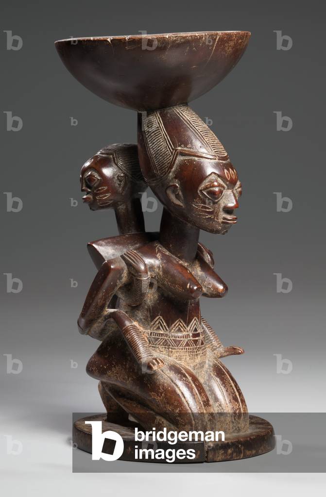 XCL500200 The mother figure of this vessel from the Southern Ekiti region represents a devotee who kneels before the gods. The vessel once held the 16 sacred palm nuts essential to divination rituals. The object was used by a priest as a medium through which to communicate with the god of fate, Orunmila, in order to gain insight into an individual’s destiny or to understand the cause of misfortune.