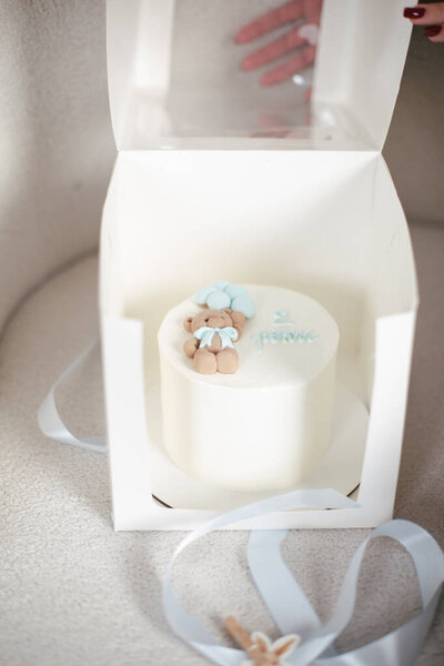 850240382 Birthday cake in box, 2 years old cake, ukrainian text. cream cake with bear decor, balls on the cake, sweets