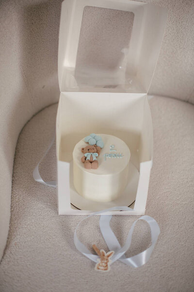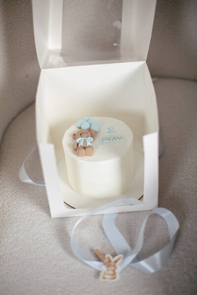 850240346 Birthday cake in box, 2 years old cake, ukrainian text. cream cake with bear decor, balls on the cake, sweets