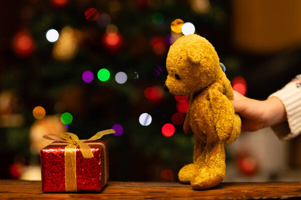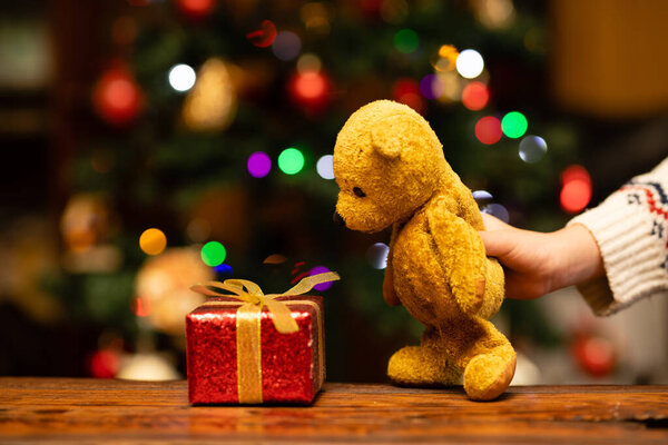 696776898 Children's hands playing with Christmas gift and teddy bear