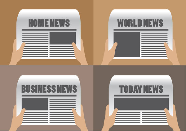 314869356 Hands holding newspaper with different section titles and headlines. Set of four vector cartoon illustration isolated on plain background.